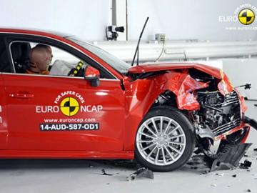 У гибридного Audi A3 из-за плохо раскрывшейся подушки безопасности голова манекена коснулась рулевого колеса. Также эксперты отметили недостаточно надежную защиту грудной клетки водителя при боковом ударе о столб.
