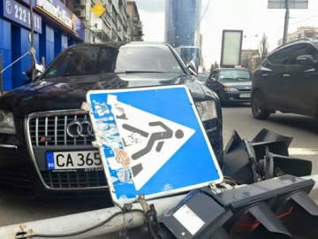 Так, на припаркованный автомобиль с европейскими номерами упал столб со знаком и светофором.