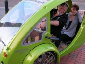 Пассажиру при этом достанется меньше пространства, чем пилоту, при этом крутить педали будет помогать электромоторчик. 600-ваттный движок позволяет аппарату достигать максимальной скорости в 32 километра в час, а если мотору немножко помочь, крутя педали, то веломобиль можно разогнать и до «фантастических» 48 км/ч.