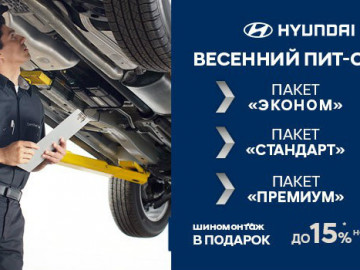 Специально для автовладельцев HYUNDAI в период с 15 марта по 30 апреля 2018 года 3 пакета диагностики на выбор, скидки на устранение неполадок выявленных при диагностики*, летние шины со скидкой до 15%** и шиномонтаж в подарок***.