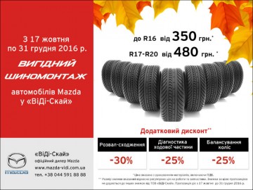З настанням холодів Ваш автомобіль потребує особливої уваги, і фахівці офіційного сервісу Mazda «ВіДі-Скай» рекомендують насамперед звернути увагу на зміну літніх шин на зимові. За умовами спеціальної пропозиції Ви можете провести шиномонтаж літньої гуми діаметром до 16 '' за ціною від 350 грн*, а діаметром 17 '' - 18 '' - від 480 грн.*