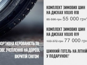 *Акційна пропозиція діє з 01.07 по 31.08.2017 р на території офіційного дилера Вікінг Моторз. Під вигодою мається на увазі придбання комплекту зимових коліс зі знижкою у 35% від регулярної вартості для дисків R18 або зі знижкою у 25% від регулярної вартості для дисків R19. Акційна пропозиція поширюється на комплект зимової гуми і диски Volvo R18 або R19 в кількості 4 штуки. За додатковою інформацією звертайтеся до консультантів дилерського центру або за телефоном +38 (044) 391 11 00.