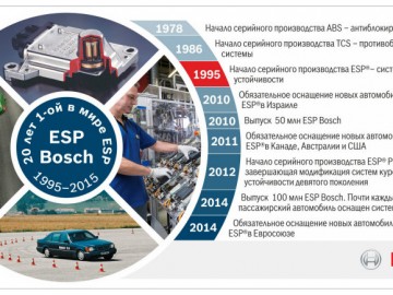 Немецкий концерн Bosch отмечает очередной юбилей. История успеха началась в 1978 г., когда компания Bosch первая в мире создала и начала серийное производство ABS – антиблокировочной системы с электронным управлением. В 1986 г. за ней последовала противобуксовочная система ASR/TCS, а в 1995 г. – программа электронной стабилизации ESP®.