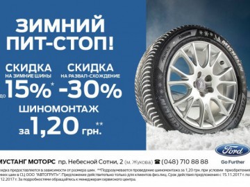В период с 15 ноября по 31 декабря 2017 года всем клиентам, владельцам автомобилей FORD, Сервисный Центр «МУСТАНГ МОТОРС» предоставляет возможность приобрести комплект зимних шин со скидкой до 15%* и дополнительно – получить шиномонтаж в ПОДАРОК**!