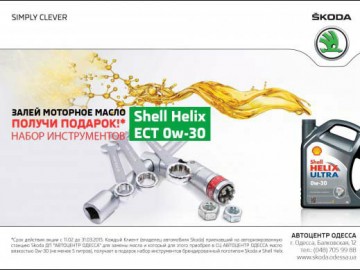 *Срок действия акции с 11.02 до 31.03.2015. Каждый Клиент (владелец автомобиля Skoda) приехавший на авторизированную станцию Skoda ДП "АВТОЦЕНТР ОДЕССА" для замены масла и который для этого приобрел в СЦ АВТОЦЕНТР ОДЕССА масло вязкостью 0w-30 (не менее 5 литров), получает в подарок набор инструментов брендированный логотипом Skoda и Shell Helx.