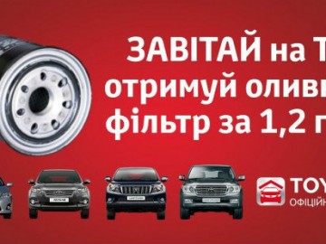 Завітай в офіційний сервісний центр Тойота на Столичному на ТО автомобілів Toyota Corolla, RAV4, Prado, Land Crusier 200 та отримуй оливний фільтр за 1,2 грн.