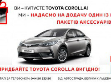 Тільки з 15.08.2018 по 30.09.2018 у Вас є неймовірна можливість придбати Toyota Corolla та отримати на додачу один із шести пакетів аксесуарів на вибір! Тож, скористайтеся спеціальною пропозицією і встигніть вигідно придбати Toyota Corolla!.