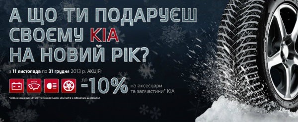 Спешите сделать подарки своему автомобилю КІА по выгодным ценам. Акция действует до 31.12.2013 года.