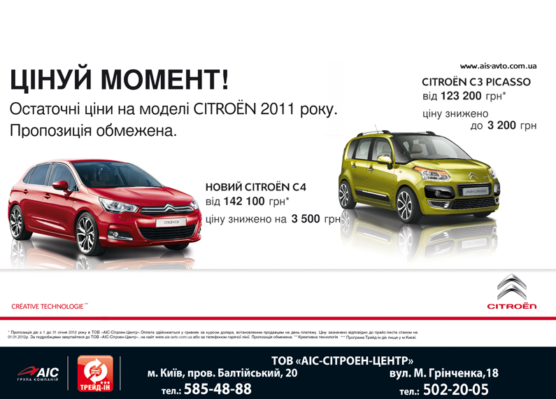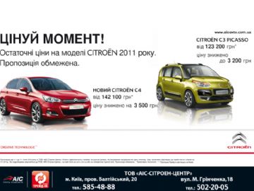 Будьте всегда в центре внимания с новым Citroёn C4. Красивый внешний вид, удобный и просторный салон, высокое качество и надежность, комфорт, широкий выбор модификаций – бензиновые и дизельные двигатели, механическая или автоматическая КПП, три уровня комплектации – аргументов в пользу этой модели предостаточно. Ценовой фактор тоже имеет значение: в январе Citroёn C4 доступен за 142 100 грн., что на 3 500 грн выгоднее прежней стоимости. Предложение касается Citroёn С4 с двигателямии 16i (110 л.с.) и VTi 120 (120 л.с.), механической или автоматической КПП в комплектациях Attraction, Tendance и Exclusive.