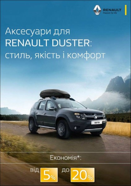 Компания Renault в Украине объявляет о запуске акции на аксессуары для модели Duster, которая будет длиться с 22 октября по 27 декабря 2015 года в официальных дилерских центрах Renault.