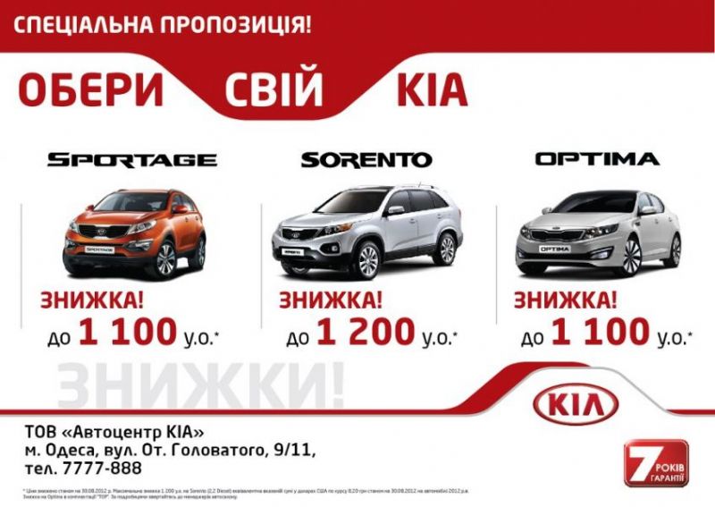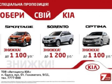 ООО "Автоцентр КИА" - официальный представитель ТМ КІА в Одесском регионе предлагает Вам хиты продаж модельного ряда с эксклюзивной скидкой! Только сейчас Вы имеете возможность приобрести KIA Sportage, Optima и Sorento по Акционным ценам: