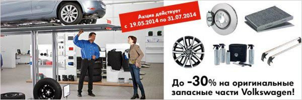 *Акция не распространяется на оригинальные запасные части группы Economy. Cкидки предоставляются согласно Приказа № 15 от 16.05.14 г. «О предоставлении для владельцев автомобилей Volkswagen скидок до -30% на оригинальные запасные части Volkswagen.»