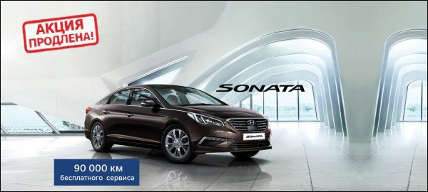 Срок действия по специальному предложению на Hyundai Sonata продлен до 31.01.2017 года! Все, кто желает приобрести модель Hyundai Sonata в этот период, гарантированно получат сертификат на сервисные услуги (ТО), который предоставляет возможность пройти обслуживание абсолютно бесплатно до 90 тыс. км включительно.