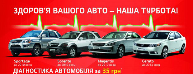 Официальный дилер автомобилей Kia в Украине, компании «Автоцентр на Борщаговке», продлевает Акцию «Здоровье вашего авто - наша забота» в период с 10.01.2018 по 31.12.2018 владельцы предыдущих моделей KIA cмогут осуществить диагностику автомобиля всего за 35 грн.
