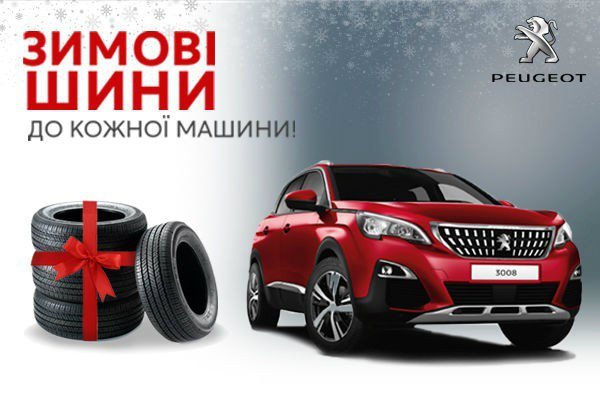 *Під подарунком мається на увазі отримання знижки при придбанні автомобіля Peugeot 301, 108, 208, 2008, Rifter, 308, 308 SW, 3008, 508, Traveller, 5008 Grand SUV і комплекту з чотирьох зимових шин Goodyear. Розмір знижки на автомобіль рівний рекомендованій роздрібній вартості комплекту з чотирьох зимових шин Goodyear для офіційної дилерської мережі Peugeot в Україні і залежить від конкретної обраної моделі і версії автомобіля. Кількість автомобілів і комплектів шин, що беруть участь в акції, обмежена. Подарунок не може бути замінений на грошовий еквівалент вартості комплекту шин. Зовнішній вигляд шин може відрізнятися від зображеного в рекламі товару.