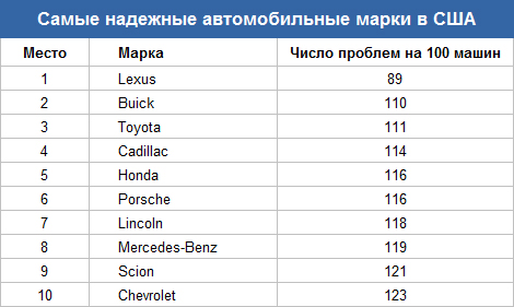 Первое место в рейтинге надежности досталось автомобилям компании Lexus. Всего экспертами было зафиксировано 89 неисправностей на 100 машин бренда. На втором месте - Buick (110 проблем на 100 автомобилей). Замыкает первую тройку Toyota. У автомобилей японского бренда обнаружилось 111 неисправностей на 100 машин. Больше всего поломок автовладельцы обнаружили в автомобилях Jeep (197 на 100), Land Rover (258 на 100) и Fiat (273 на 100).