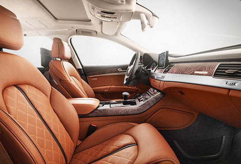 Интерьер спецверсии A8 обшит анилиновой кожей коньячного оттенка, которая используется для мебели Poltrona Frau и, по словам представителей «Ауди», сохранила свой естественный внешний вид и является очень мягкой.