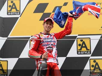 21-летний австралийский мотогонщик Кейси Стоунер выиграл чемпионат мира в королевском классе (800 кубических сантиметров), завоевав чемпионский титул за три гонки до окончания первенства, сообщает .