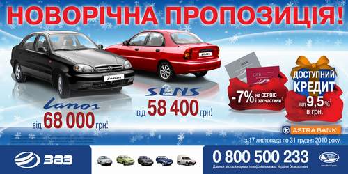 Кстати, акция «Новогоднее предложение от ЗАЗ», по которой можно, имея наличными только 5 000 – 10 000 грн., стать хозяином новенького Lanos или Sens, продолжается. Те, кто не успел воспользоваться этой удивительно выгодной кредитной программой до новогоднего празднования, может успеть сделать это до 20 января. Но нужно спешить, ведь количество авто ограничено. Условия акции те же. В подарок к приобретенному «народному» авто идет дисконтная карта «CarMan@CarWoman» уже с максимальной скидкой 7% на дальнейшее сервисное обслуживание и запасные части в официальной дилерской сети «УкрАВТО». Также карта «CarMan@CarWoman» - это еще и постоянно действующая скидка 10% в популярных киевских ресторанах «Kidev» и «Первак», 3% скидка в туристической компании Гермес Тревел Групп и скидка на топливо высочайшего европейского качества на автозаправочных комплексах Корпорации «УкрАВТО».