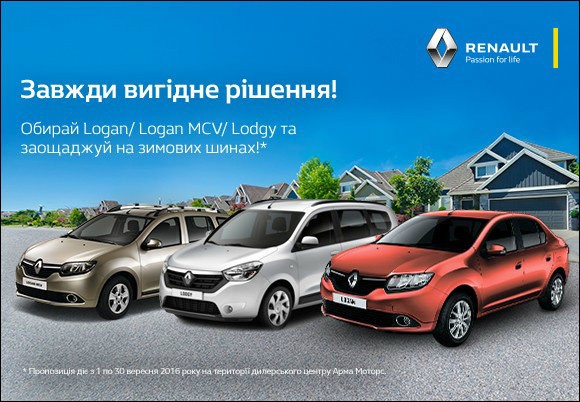 Арма Моторс повідомляє про проведення акції "АВТО RENAULT - ЗАВЖДИ ВИГІДНЕ РІШЕННЯ!". З 1 по 30 вересня при покупці Renault Logan, Logan MCV, Lodgy ми даруємо Вам комплект зимових шин у подарунок!