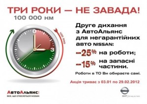 Например, хитом 2011 года была программа по сервисному обслуживанию автомобилей старше трех лет. Руководствуясь пожеланиями клиентов, дилерский центр продлевает действие этой акции до конца февраля 2012 года, предлагая провести сервисные работы с 25% скидкой или приобрести автозапчасти с 15% скидкой. Кроме того, при прохождении любого вида ТО каждый владелец автомобиля Nissan, получает в подарок* проверку развал-схождения автомобиля (*под подарком подразумевается приобретение услуги за 1 грн.)
