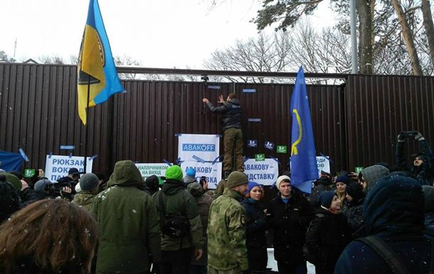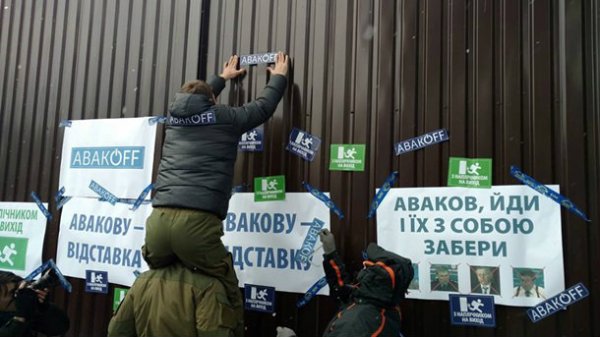 На заборе здания активисты наклеили плакаты "АвакOFF", "Авакову – отставка" и др.