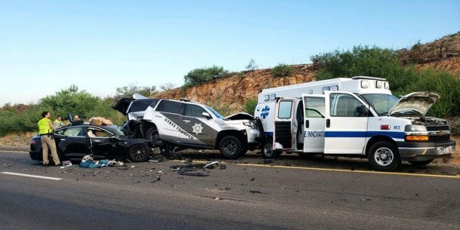 Тройная авария, виновником которой стал автомобиль Tesla Model S, произошла во вторник на автомагистрали штата Аризона (США). Сначала электрокар врезался в полицейский внедорожник Chevrolet Tahoe, а тот, в свою очередь, стукнул заднюю часть автобуса скорой помощи. Оба автомобиля работали на месте другой аварии. К счастью, полицейского в автомобиле в тот момент не было, да и в скорой никто не пострадал, сообщает .
