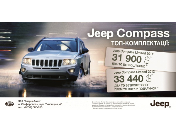 Скидка на Jeep Compass 2012 г. составляет 16 000 грн. и предлагается по акционной цене – 31441 у.е., также Вы получаете 2 ТО в подарок. Данное ценовое предложение является весьма привлекательным для автомобиля такого класса. Поспешите воспользоваться удобным случаем и приобрести компактный и стильный американский кроссовер по суперцене. Узнайте больше информации у официального представителя Крайслер Групп Интернешенл ЛЛС в Крыму – компании «Таврия-Авто».