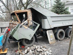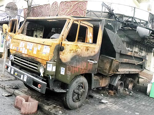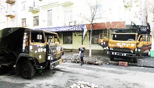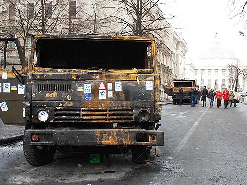 Автомобили, которые погибли в Киеве Автомобили – они тоже «солдаты». И если на вооружении подразделений МВД были тяжелые армейские грузовики и автобусы, то активисты могли противопоставить лишь легковой автотранспорт.