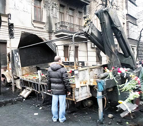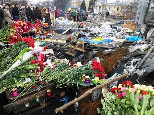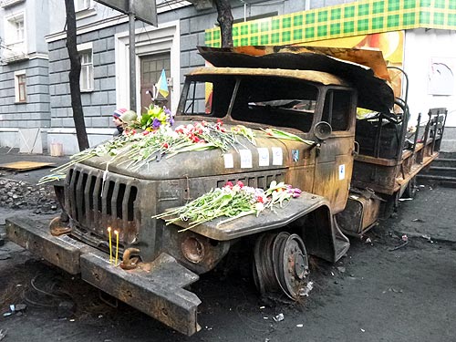 На выходных киевляне массово пришли на Майдан, почтить память погибших героев. Все баррикады на Институтской и Грушевского были устланы цветами. Картина выжженного асфальта и проволочных кордов от шин давала представления, что здесь было очень жарко. Но цветы наш фотокорреспондент обнаружил и на «погибших» автомобилях. Они тоже были «солдаты» и стали жертвами этой никому не нужной войны.