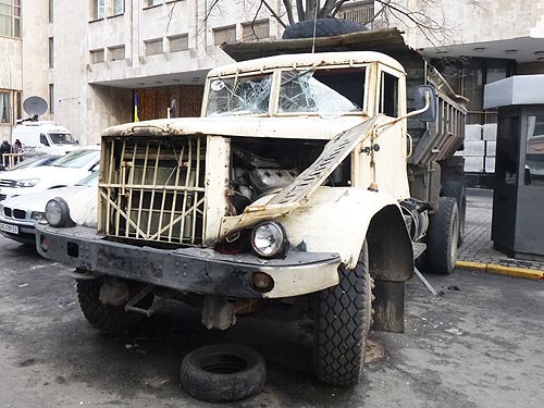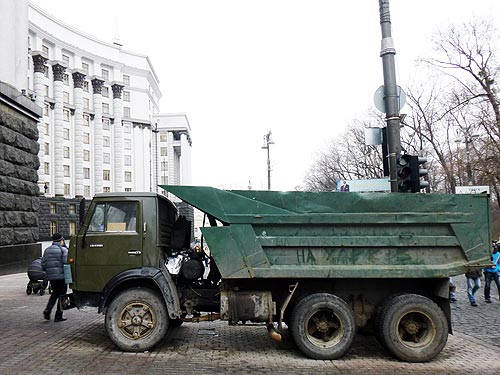 Вначале тактика МВД была в блокировании улиц с помощью обычных самосвалов, которые ставили поперек улицы. Но против «коктелей Молотова» - грузовики были бессильны. Так и остались стоять на Шелковичной и Институтской сгоревшие остовы стареньких КАМАЗ-55111. Навсегда остановился на Институтской и УРАЛ-4320, и КрАЗ-65053. А старенький КРАЗ-256 еще имеет шанс уехать своим ходом.