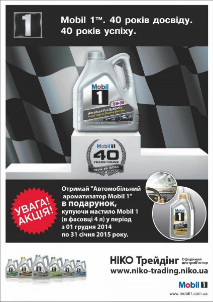 Компания «НИКО Трейдинг», официальный дистрибьютор смазочных материалов Mobil, с 1-го декабря 2014 по 31-е января 2015 дарит всем своим клиентам, покупателям 4-х литровой канистры Mobil 1, гарантированный подарок – автомобильный ароматизатор.