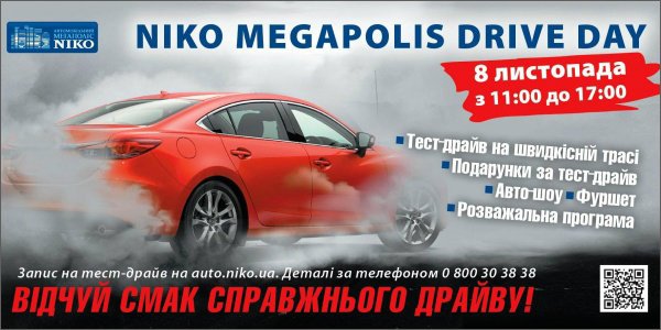 «Автомобильный Мегаполис НИКО» на Бориспольском шоссе, в состав которого входят дилерские центры Citroen, Ford, Renault, Mitsubishi, Mazda и Suzuki, приглашает в субботу, 8-го ноября, поклонников качественных автомобилей и скоростной езды на тест-драйв NIKO Megapolis Drive Day.