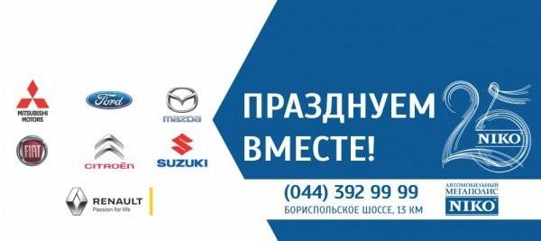 «Автомобильный Мегаполис НИКО» на Бориспольском шоссе приглашает своих клиентов отметить 25-летие Группы компаний «НИКО». До конца октября в салонах, малярно-рихтовочном комплексе и на сервисных станциях Мегаполиса вас ждут праздничные скидки и подарки.