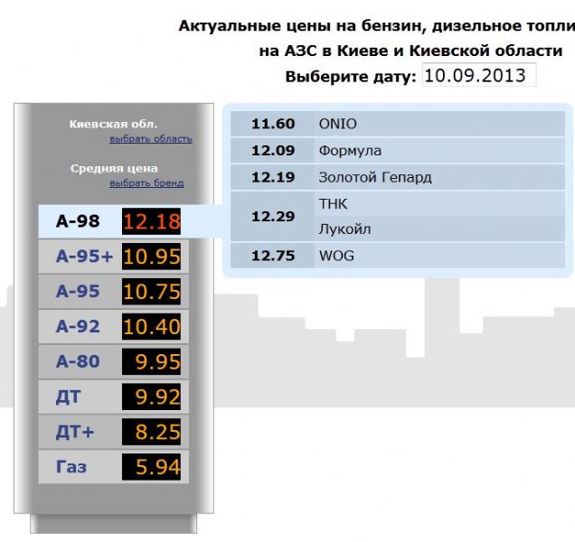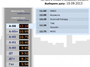 "Бензин А-95 для правительственной автобазы стоит 9,7 гривен за литр, А-98 - 10,9 гривен за литр, А-76 - 9 гривен за литр. Дизтопливо заказано по 8,4 гривен за литр в случае бензовозные партий и по 10,09 гривен за литр по талонам", - говорится в сообщении.