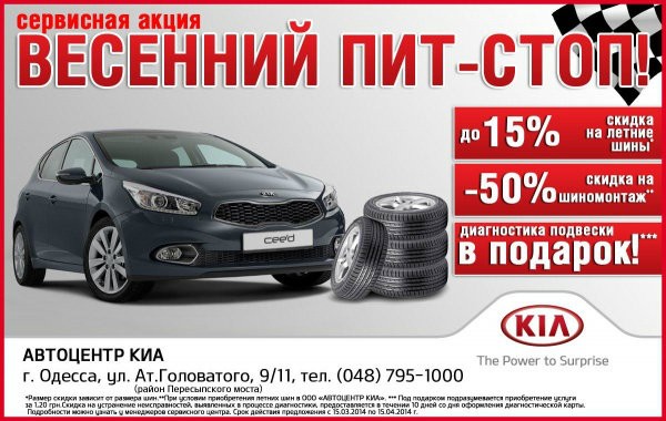 В период с 15 марта по 15 апреля 2014 года, каждый клиент, владелец автомобиля KIA, получает право на проведение диагностики подвески автомобиля в подарок*** и шиномонтаж со скидкой 50%**, при условии приобретения комплекта летних шин со скидкой до 15 %.*