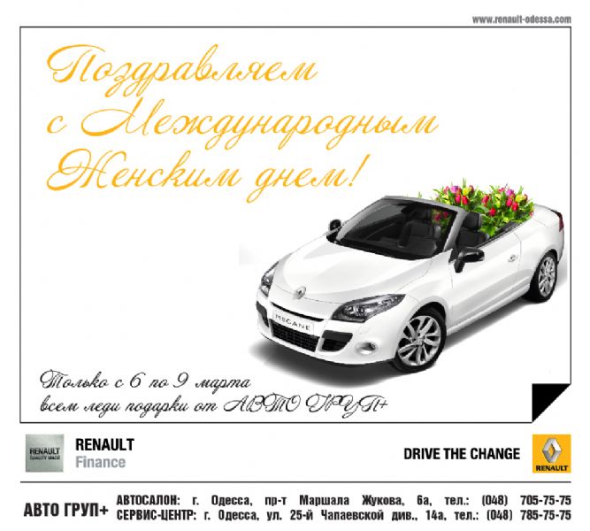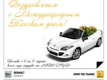 В преддверии прекрасного дня Автоцентр RENAULT ООО «АВТО ГРУП+» с 6 по 9 марта дарит подарки и хорошее настроение каждой клиентке!