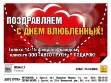 Только с 14 по 15 февраля 2013 года, посетив автосалон RENAULT , с вашим любимым человеком, Вы гарантировано получите подарок и великолепное настроение.
