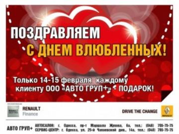 Самый романтический праздник в году – День Влюбленных – прекрасный повод подарить любимому человеку теплые и незабываемые мгновения! А поможет Вам в этом автосалон RENAULT.