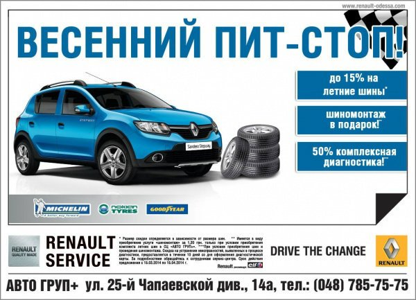 В период с 15 марта по 15 апреля 2014 года, каждый клиент, владелец автомобиля RENAULT, получает право на проведение шиномонтажа в подарок* и проведения комплексной диагностики (осмотр на посту инструментального контроля) со скидкой - 50%, при условии приобретения комплекта летних шин со скидкой до 15 %.**