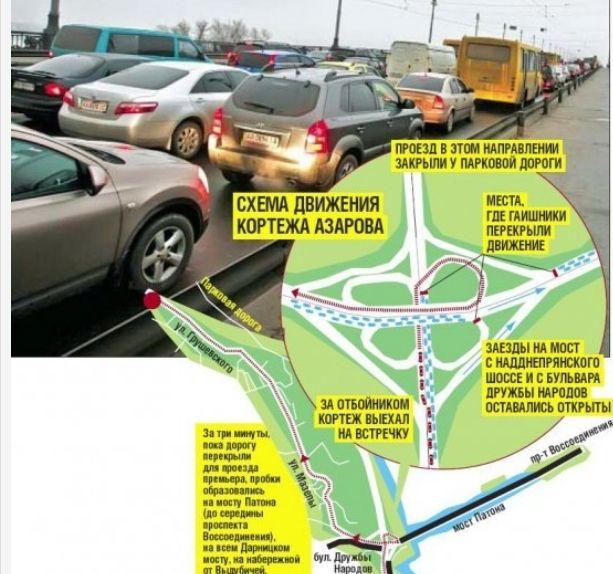 У развязки моста Патона, где заканчивается отбойник, кортеж выехал на встречную полосу, обогнул затор и заехал на бульвар Дружбы народов, далее помчался по улице Мазепы вверх, к Лавре. Как только Азаров проехал, автомобилисты традиционно начали возмущенно сигналить. Однако пустили транспорт через полминуты, в 8:30.