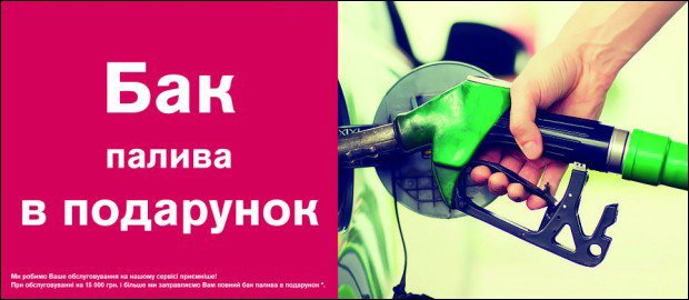 Печально когда ремонт любимого автомобиля требует много времени и денег. Мы делаем Ваше обслуживание на нашем сервисе приятнее! При обслуживании на 15 000 грн. и более мы заправляем Вам полный бак топлива в подарок*..