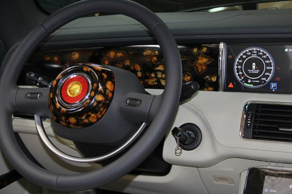 Отделка салона выполнена из качественных материалов — светлой кожи и полированных деревянных панелей.