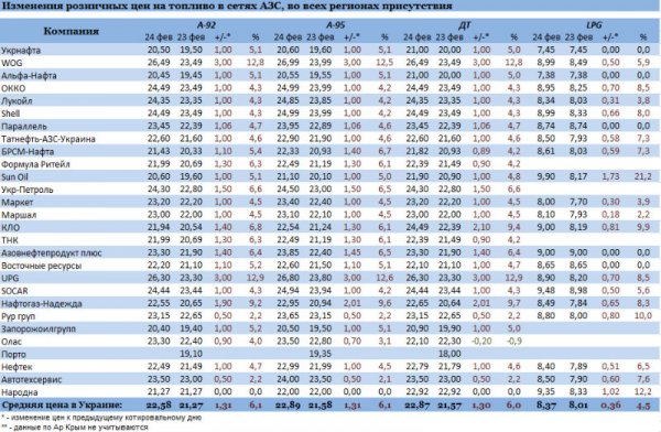 Сегодня, 24 февраля, стоимость бензина вновь подскочила на 1,5-3 грн. Средневзвешенная стоимость "двойки" и "пятерки" повысилась на 1,31 грн – до 22,58 грн/л и 22,89 грн/л соответственно. Об этом свидетельствуют данные мониторинга Консалтинговой группы "А-95".