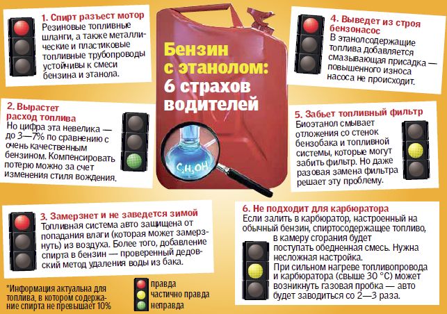 Существует теоретический риск, что в двигателе смесь разделится на бензин и водно-спиртовые шарики. Последствия попадания их в камеру сгорания очевидны: перерасход топлива (вода не вырабатывает энергии) и детонация. Кроме того, есть сомнения в том, что авто будет заводиться при низких температурах (например, 30 градусах ниже нуля) — ведь напитавшийся водой спирт превратится в льдинки, поджечь которые система зажигания не в состоянии.