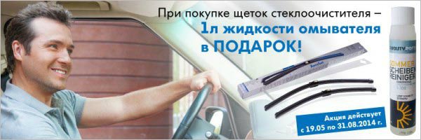 *Акция не распространяется на оригинальные запасные части группы Economy. Cкидки предоставляются согласно Приказа № 16 от 16.05.14 г. «О предоставлении для владельцев автомобилей Volkswagen в подарок 1л омывателя при приобретении щеток стеклоочистителя и ремкомплектов щеток стеклоочистителя».