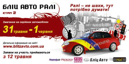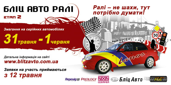 Рады сообщить вам, что 31 мая и 1 июня автосалон «Блиц-Авто», структурное подразделение Корпорации УкрАВТО, совместно с '' LiveRacing '' при спонсорской поддержке торговой марки «Prology» и эксклюзивного представителя шин «NEXEN» в Украине компании «Интертаерс» проводят в Киеве второй этап Кубка автосалона «Блиц-Авто» и по совместительству третий этап Кубка ФАУ по ралли на серийных автомобилях.