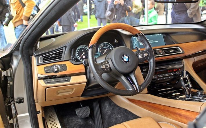 Интерьер Gran Lusso практически ничем не отличается от других моделей BMW, в частности, от купе 6-Series. Разница заметна в оформлении дверей и рулевого колеса, а также в материалах отделки. Так, вставка на передней панели выполнена из новозеландского каури – одного из древнейших видов хвойных деревьев, а потолок отделан шерстью.