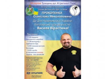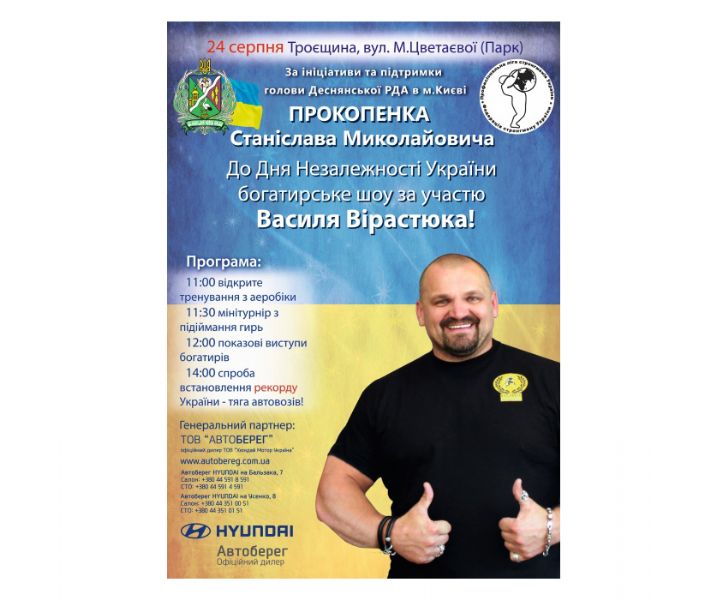 24 августа Федерация стронгмену Украины, ко Дню Независимости Украины, по инициативе и поддержке головы Деснянской РГА в городе Киеве Прокопенко Станислава Николаевича, а также генеральных спонсоров мероприятия: ООО "Хюндай Мотор Украина" и компании "Автоберег", приглашает Вас принять участие в феерическом силовом представлении!.
