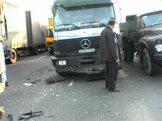 Водитель Renault говорит, что перед ним со второй полосы выехала какая-то легковушка. Она начала притормаживать, включила поворот и хотела уйти направо на прилегающую улицу. Водитель Magnum тоже нажал на тормоз, а вот водитель Mercedes не успел затормозить, взял влево, и все… Удар… На дороге осталась лежать куча обломков.